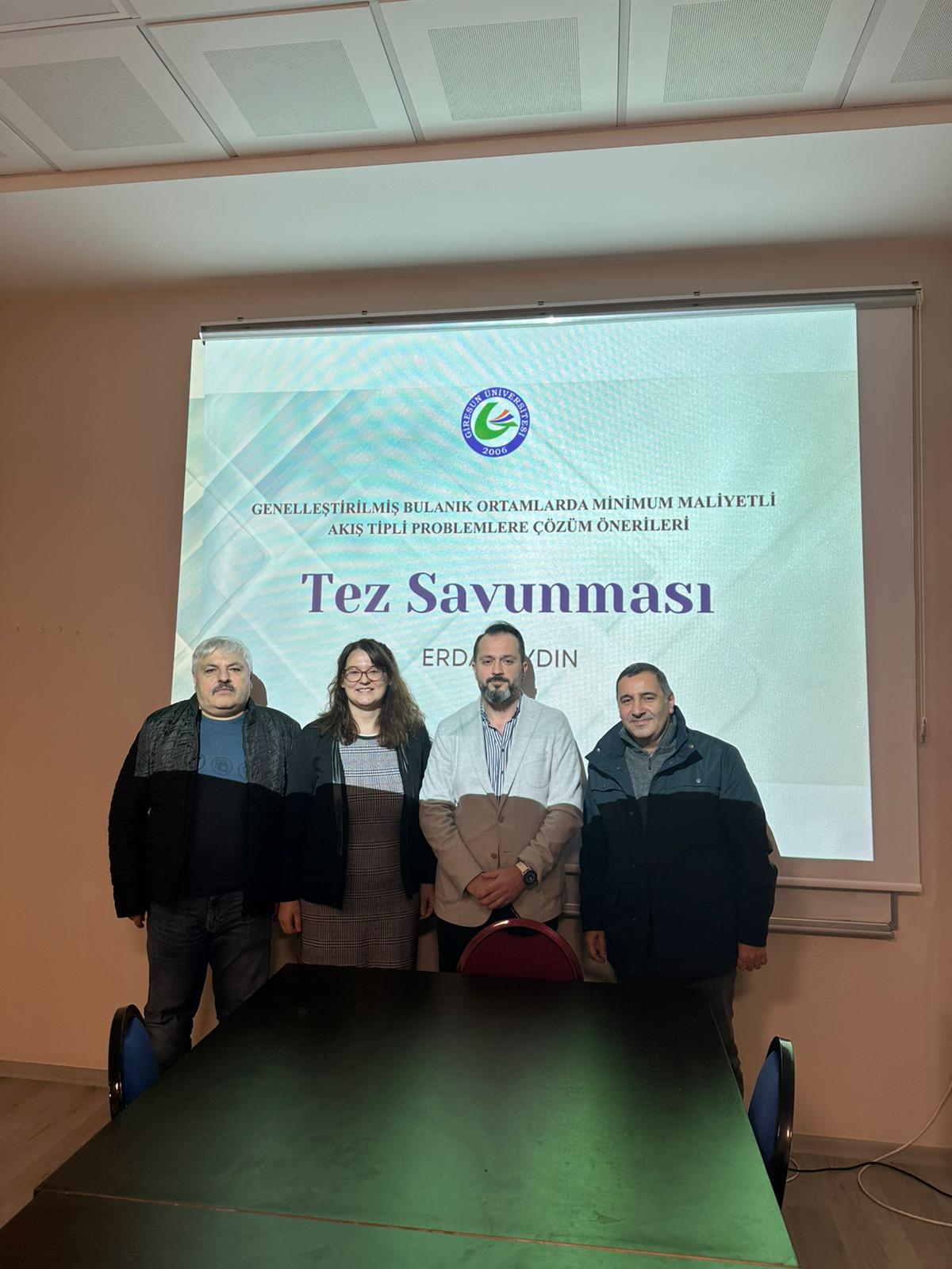 Yüksek Lisans öğrencimiz Erdal AYDIN'ın, Doç. Dr. Hande GÜNAY AKDEMİR danışmanlığındaki "Genelleştirilmiş Bulanık Ortamlarda Minimum Maliyetli Akış Tipli Problemlere Çözüm Önerileri" başlıklı tezininin savunması 31.12.2025 Saat 11.00'da gerçekleştirilmiştir. Yüksek Matematikçi unvanını alan Erdal AYDIN'I ve danışmanı Sayın Doç. Dr. Hande GÜNAY AKDEMİR'i tebrik eder, başarılarının devamını dileriz.