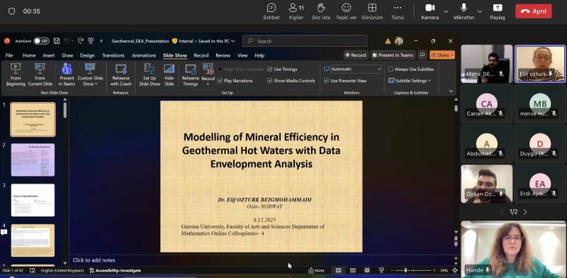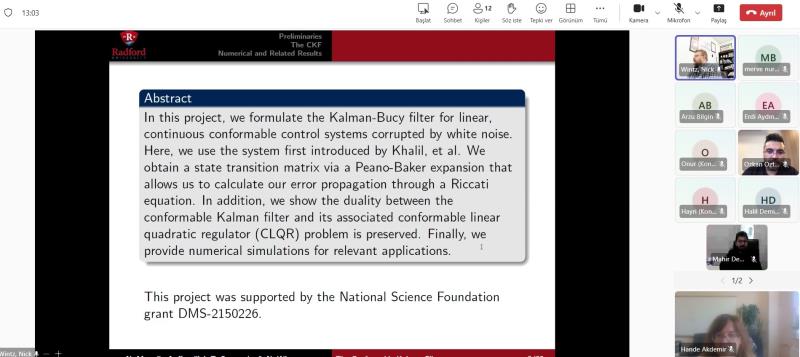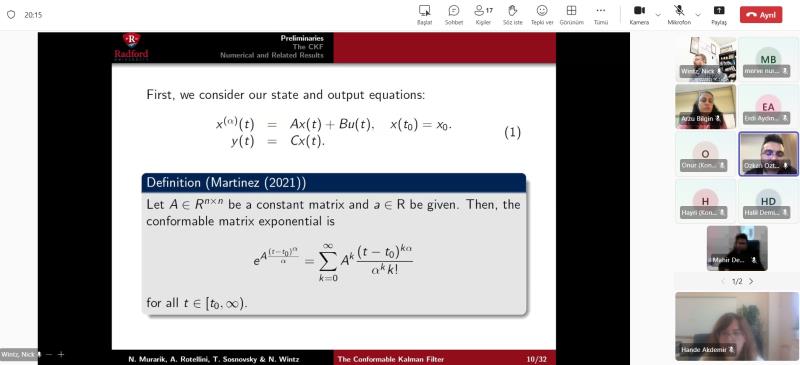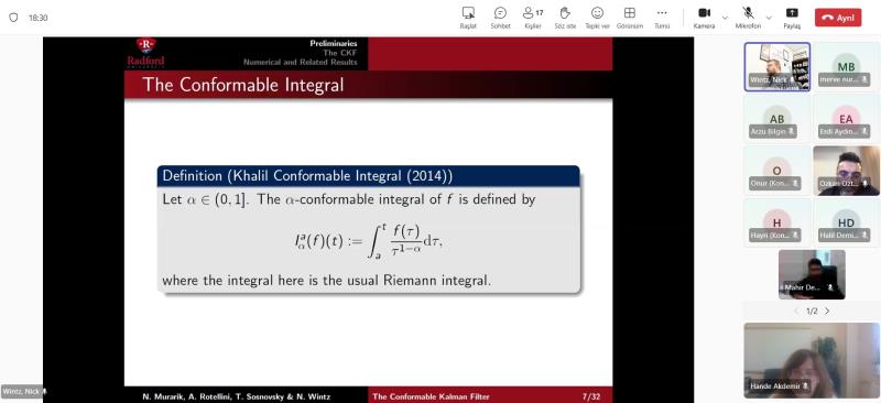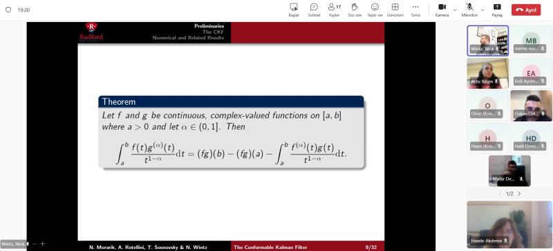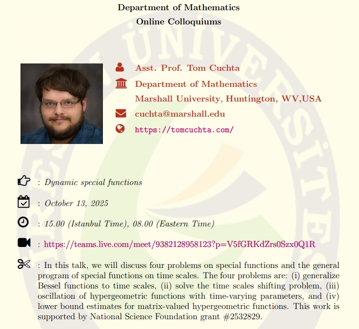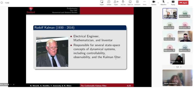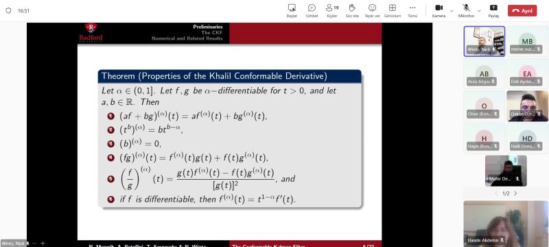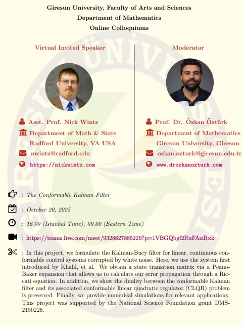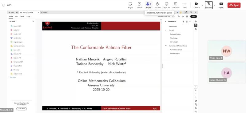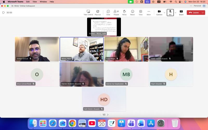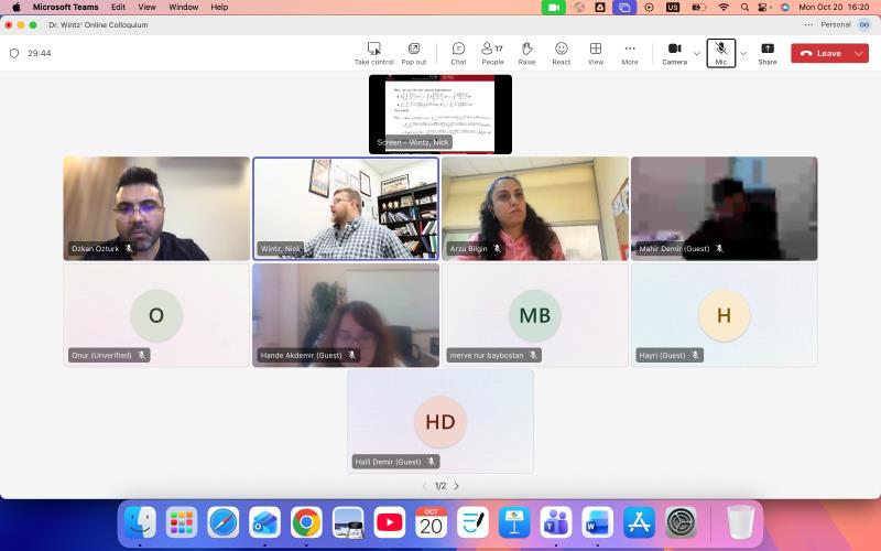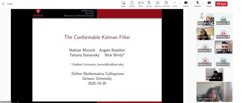 Dr. Öğretim Üyesi Nick Wintz Giresun Üniversitesi Fen Edebiyat Fakültesi Matematik Bölümü'nün misafiri olarak çevrimiçi bir seminer vermiştir. Nick Wintz'e, Moderatörümüz Prof. Dr. Özkan Öztürk'e ve tüm katılımcılara teşekkür ederiz. (20.10.2025)