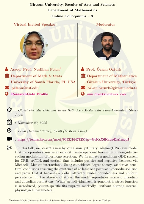 Doç. Dr. Neslihan Pelen, Bölümümüzün misafiri olarak çevrimiçi bir seminer vermiştir. Kendisine, Moderatörümüz Prof. Dr. Özkan Öztürk'e ve tüm katılımcılara teşekkür ederiz. (20.11.2025)